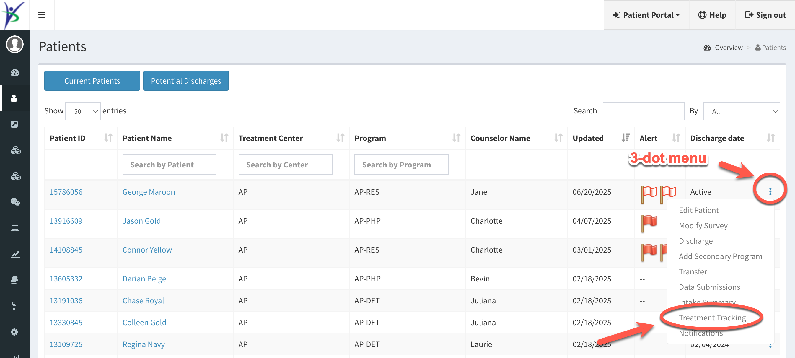 Click on the 3 dots on the far right of the patient’s entry. A dropdown menu will appear. Select "Treatment Tracking."